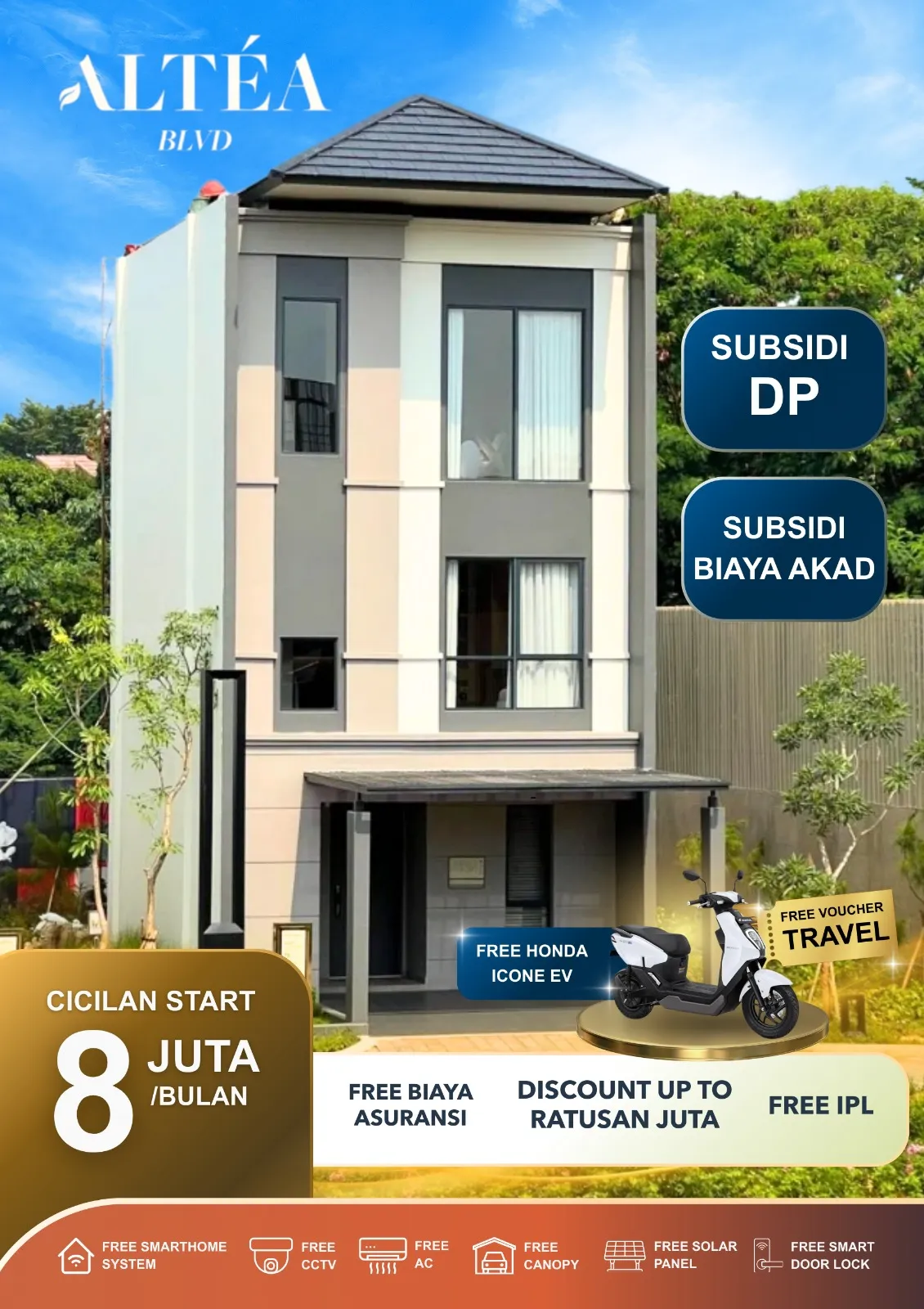 Altea BLVD adalah wujud kolaborasi prestisius antara Astra Land Indonesia dan Sinar Mas Land. Berdiri di atas lahan seluas 75 hektar, kawasan ini dirancang bukan sekadar sebagai tempat tinggal, melainkan sebuah kota mandiri (township) yang ikonik di Cibubur. Menggabungkan standar kualitas konstruksi Astra yang presisi dengan pengalaman tata kota Sinar Mas yang legendaris, Altea BLVD menawarkan aset properti paling bernilai dan aman untuk masa depan keluarga Anda. Altea BLVD menawarkan hunian nyaman dengan akses strategis, hanya 1 menit dari Tol Jatikarya dan dekat stasiun LRT Harjamukti.